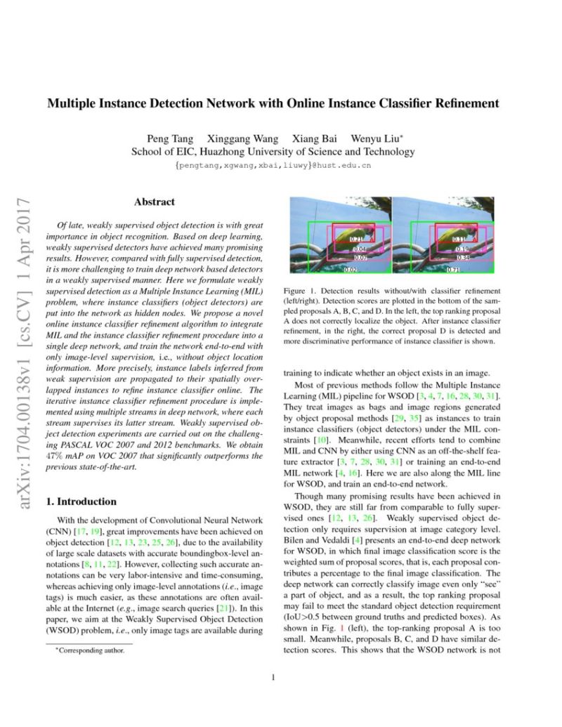 - Multiple Instance Detection Network with Online Instance Classifier Refinement | DeepAI